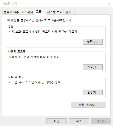 다음과 같은 창이 나오면 환경 변수를 클릭해준다.