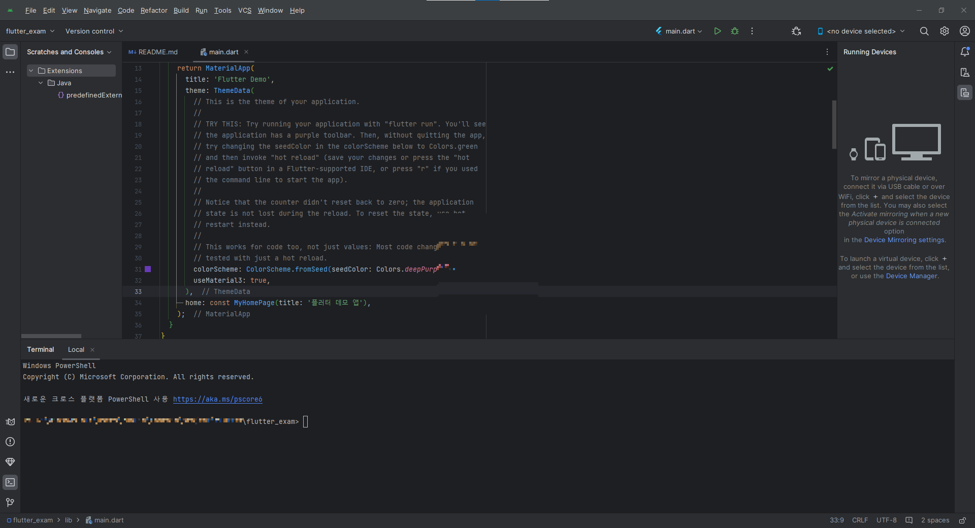플러터가 잘 연결되었는지 확인하기 위해, 터미널을 눌러 실행해준다.