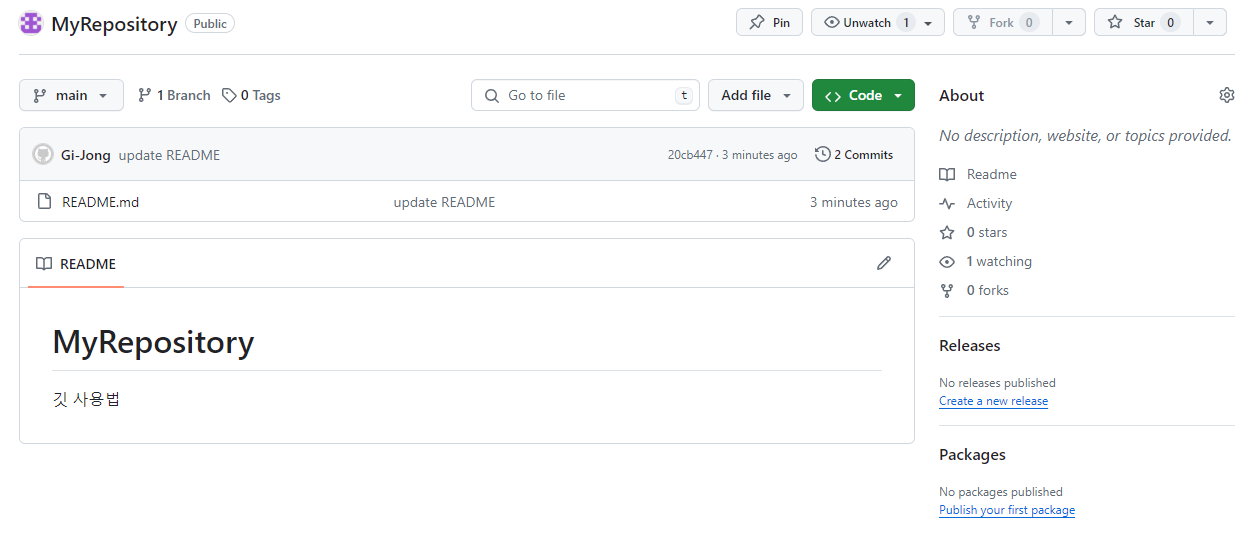 원격저장소를 확인해 보면 아까 수정한 '깃 사용법'이라는 단어가 추가되었습니다.