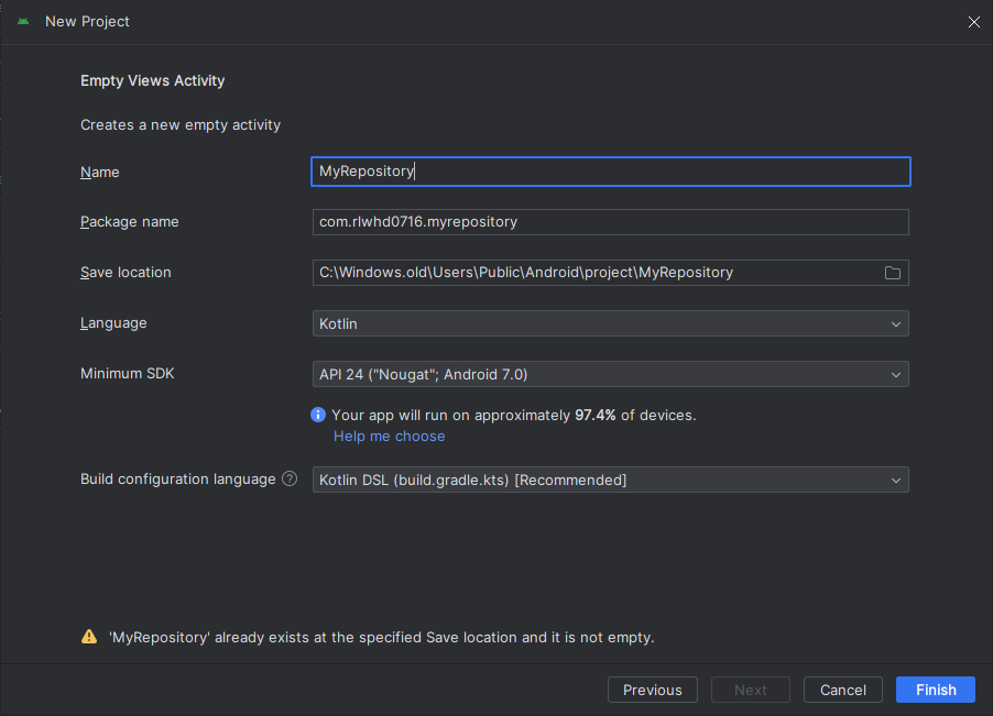 프로젝트 또한 저장소 이름과 동일하게 만들어주면 다른 설정 없이 쉽게 git 저장소를 활용할 수 있습니다.